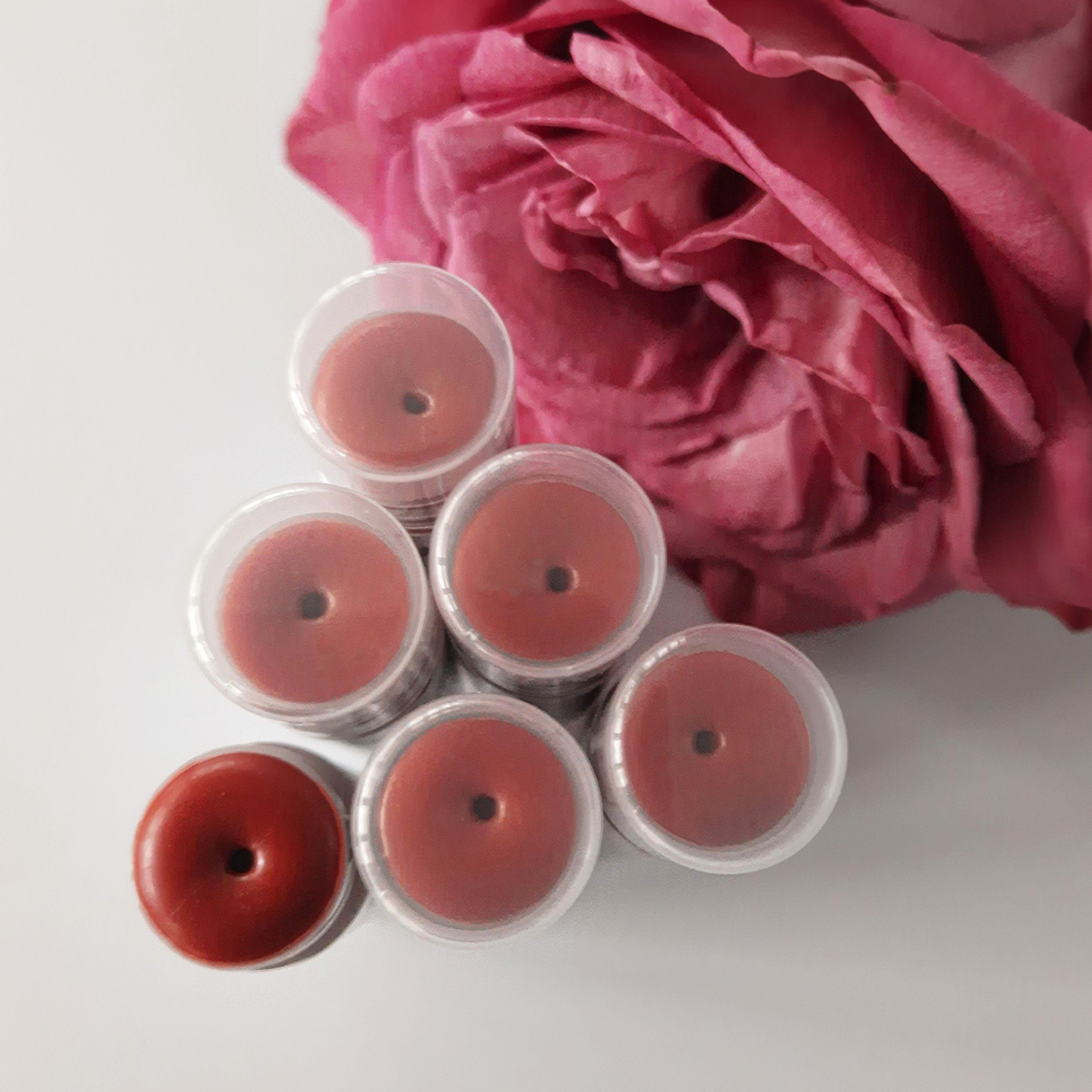 Since iron oxide is heavier than the ingredients of Just the Goods' lip balm formula, much of it fell to the bottom of the cup while I was pouring the batch of limited edition shimmering rose vegan lip balm into tubes. As a consequence, I have 6 tubes that are notably darker than the others... what shade are they? It's a mystery! Various shades of pink-ish brick red, and they might even change throughout the tube. Mine at home is the very last tube poured and it's a shiny sheer brick red.